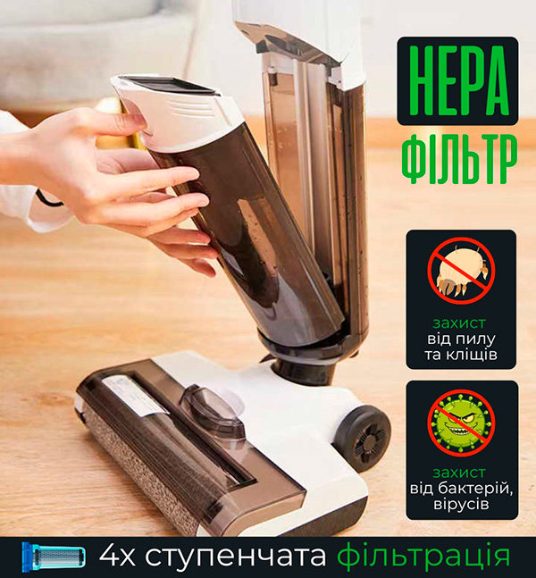 Пилосос оснащений ефективною системою фільтрації, яка утримує дрібнодисперсний пил усередині, забезпечуючи чисте повітря та охайність у всьому домі.